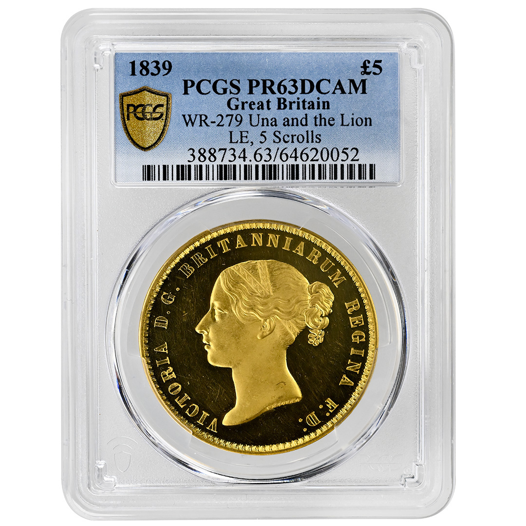 1839 5 Sovereign, Una and the Lion PCGS PR63DCAM, Victoria