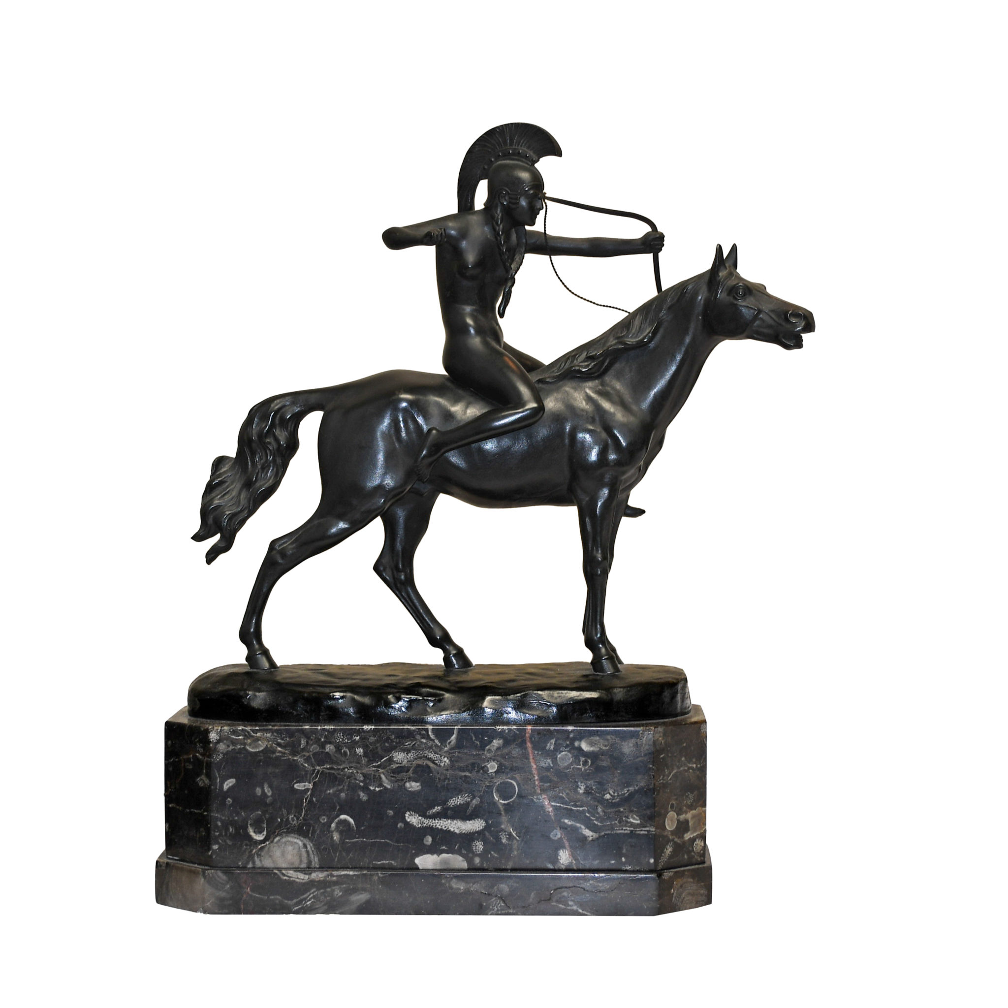 Bronze & Marble Sculpture of an Amazon on Horseback by Otto Poertzel Circa 1920